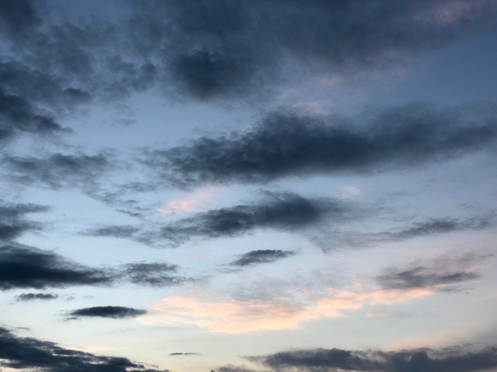 Charcoal and chalk meet in the early sky above air swept clean by overnight rain. Each adds its texture to the new day- bright and smudge, fluff and shadow- making for an esthetic that stirs and soothes with contrast, balance, and beauty. This morning would not be so lovely, so complete, so promising, were one not there.