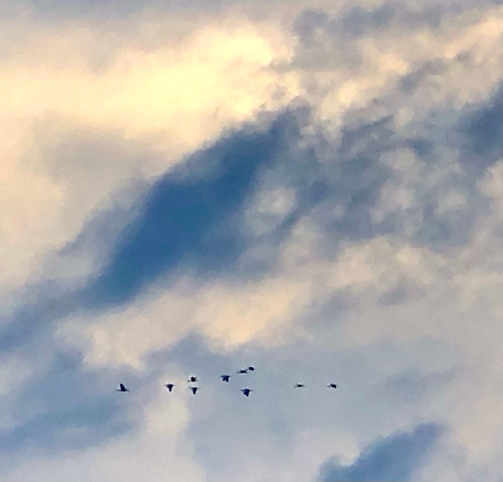 Like a strand of dark beads blown in slow motion against the pale, a long string of birds soared. Swooping and dipping in the early sky, all fly in the same direction in the current of new light. As though by some irresistible, invisible pull, they follow a silent call.