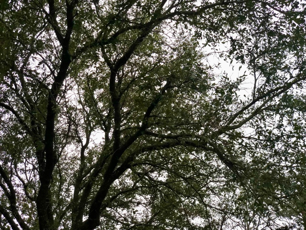 The tangle of live oaks makes for a picturesque view of the colorless early sky, or at least its backdrop. The fixture of them draws attention to their intricacies and complications, obfuscating the great beyond. A chill breeze blows, but they do not budge, holding fast their weblike canopy that hangs overhead and by its nature and nearness, closes in.
