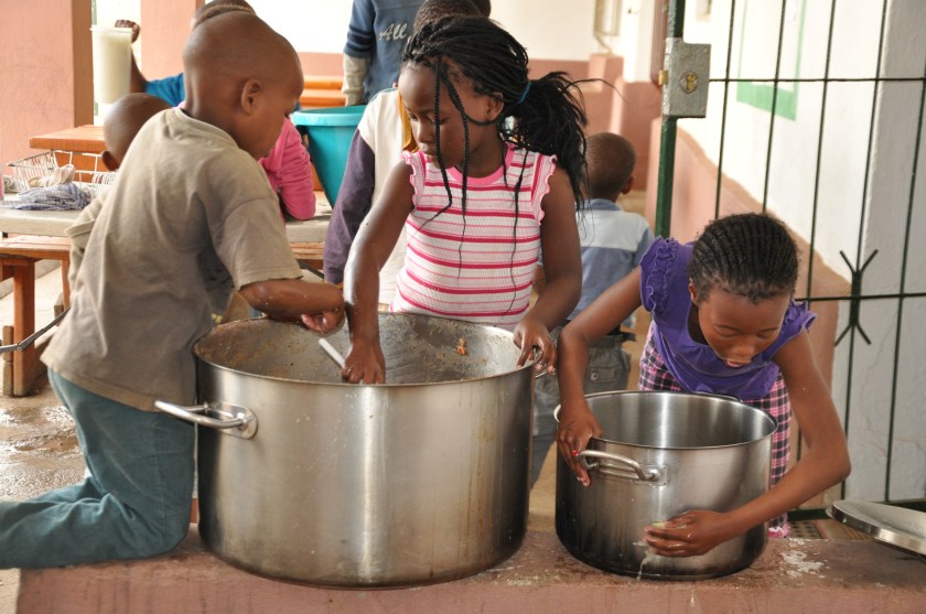 S Africa, children wasking pots