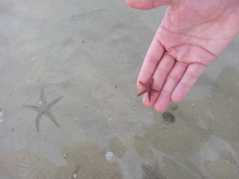 Star fish and sand dollars on sand bar, 7-16